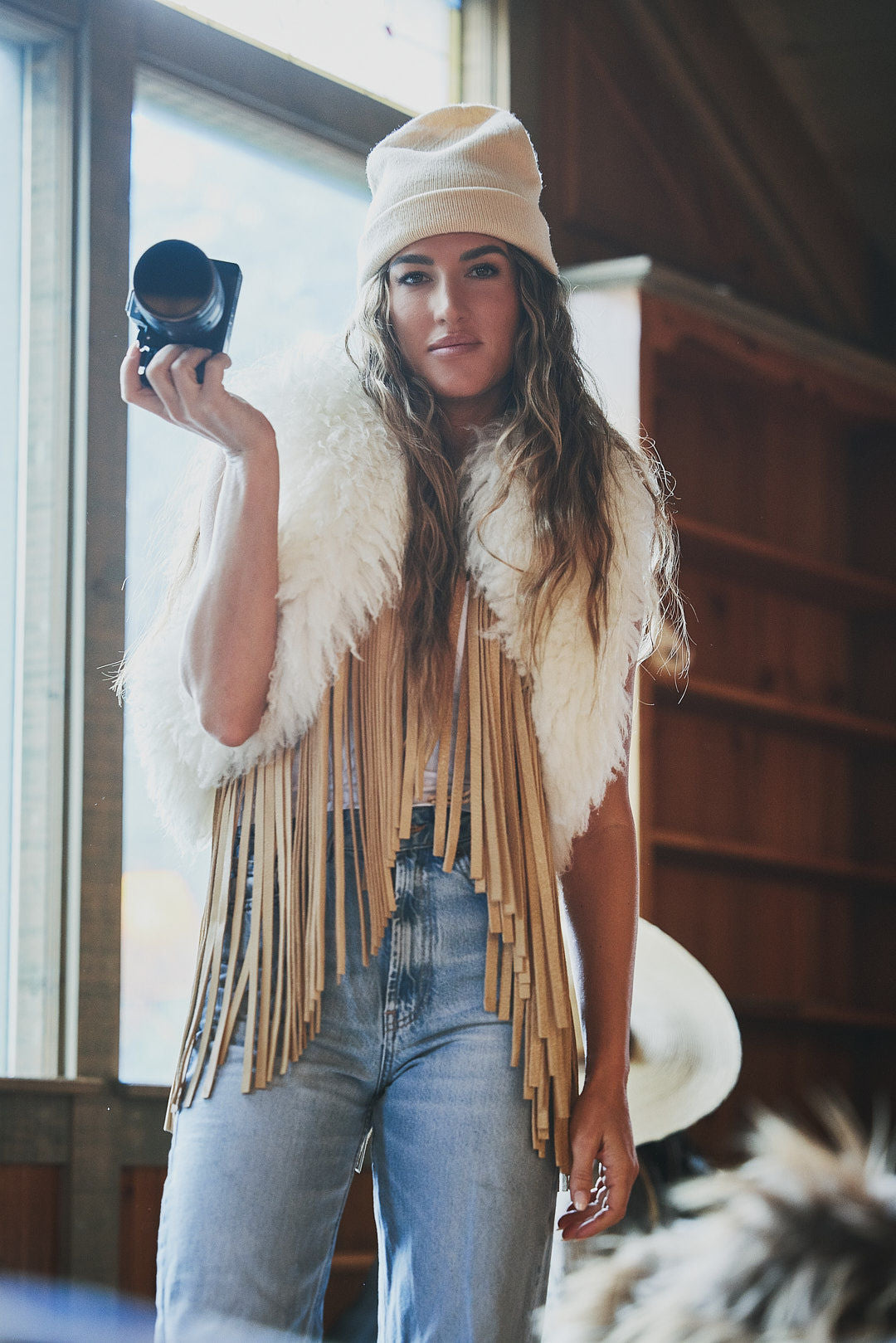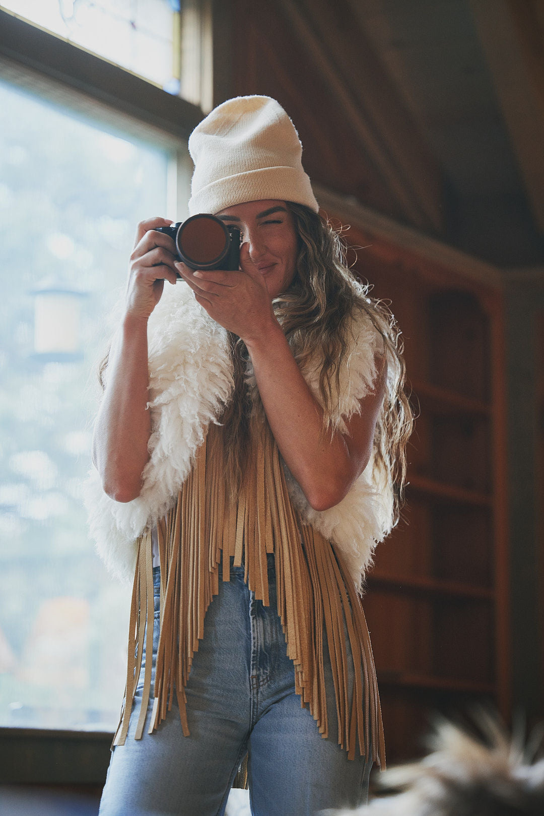 This vest is handcrafted using free-range, organic sheepskin — prized for its naturally curly, luxurious texture. Designed off our best-selling Cascade body, this new version features a dropped armhole and slightly slimmer shoulder line to balance the sheepskin’s volume. Finished with long, deer-tanned leather fringe that sweeps from the front, around the hem, and through the back. Oversized and airy, this vest wears beautifully across sizes and seasons. Wear it over a sweater or blouse this fall.