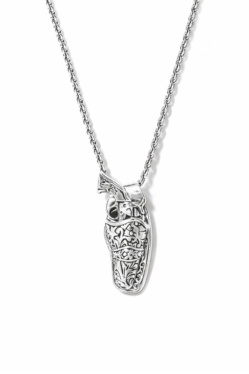 Artisan Craft: Each pendant is handmade start-to-finish by local fine jewelry artisans, with attention to detail and 1940s-inspired design. Western floral tooling adorns the holster, and a steer head embellishes the handle of the vintage Colt revolver.