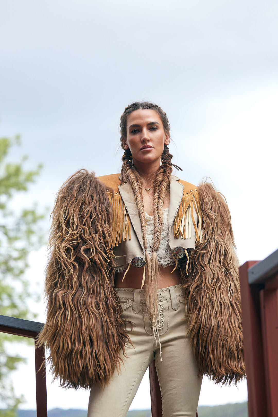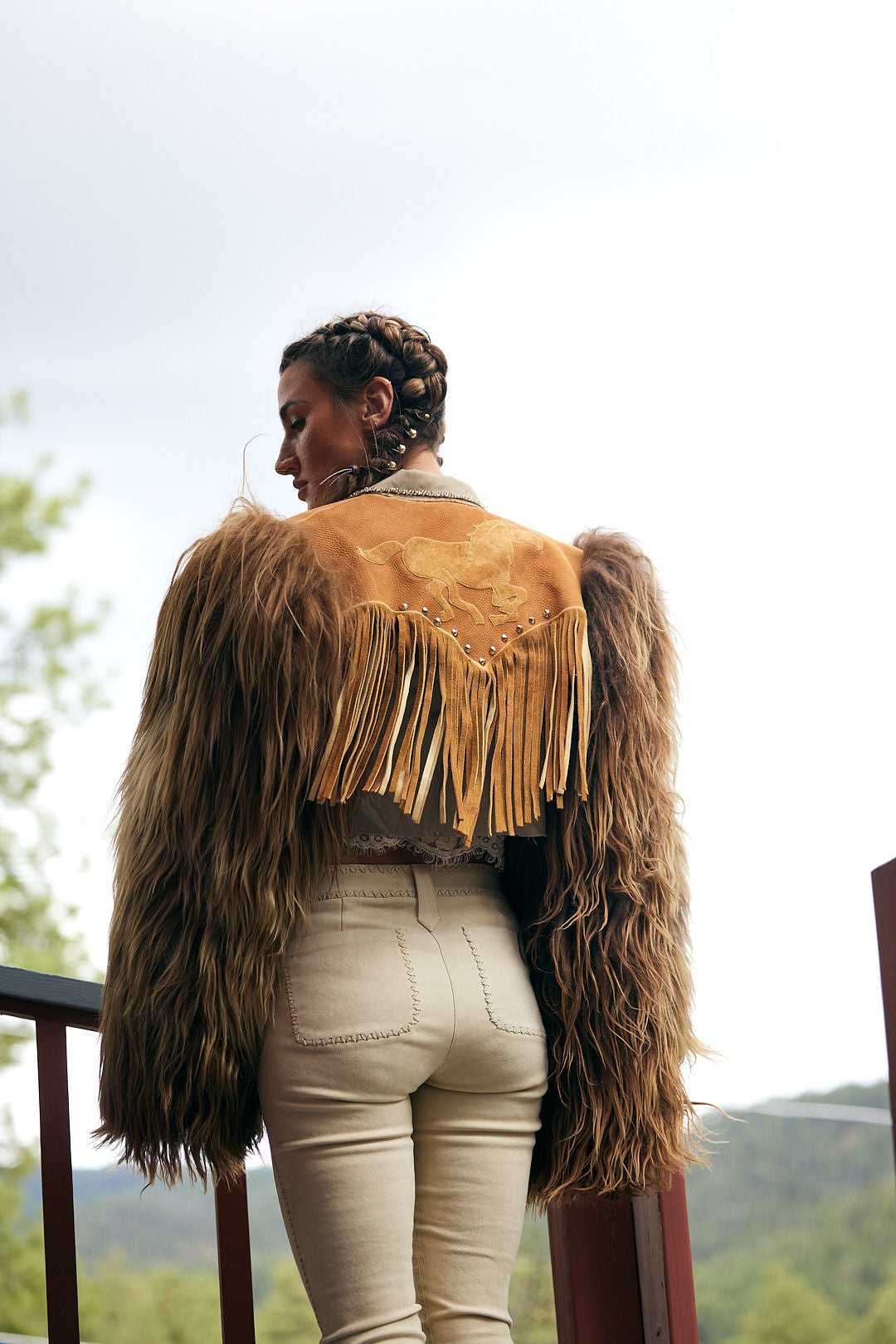 The Westerly Chap Jackets are made with Organic Eco Sheepskin sleeves from Holland, a quality vintage blazer (often designer), and quality elements like Swarovski crystals, sterling silver vintage conchos, Eco -top tier Brazilian cowhide, soft deer tanned leather, and metal rivets. Each chap jacket is completely unique. Check each for sizing and details.